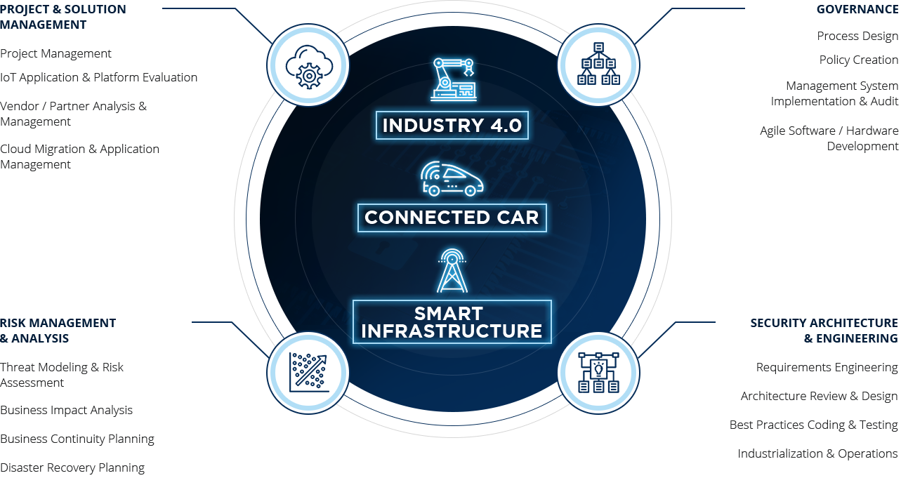We help you to develop your products securely to use the enormous advantages of IoT applications. This applies to areas such as Connected Vehicles and the Industry 4.0 (Industrial IoT).